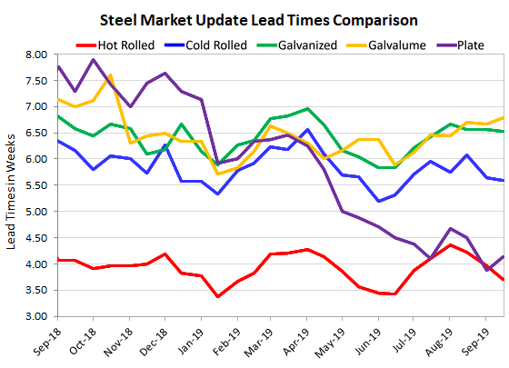 Hot rolled lead times now average 3.71 weeks, shortened from 4.22 weeks at this time last month. The average cold rolled lead time has dipped slightly to 5.59 weeks from 6.07 weeks in mid-August. The average lead time for galvanized has dipped to 6.52 from 6.57 weeks, while the lead time for spot orders of Galvalume is up slightly at 6.78 weeks.