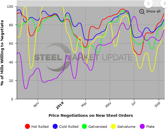 Suppliers of coated steel are much more likely to discuss discounts than they were a month ago. Eighty-four percent said their galvanized suppliers are willing to deal, a jump of 30 percentage points from mid-August. Just 16 percent of respondents reported galvanized mills declining to compromise on price. Seventy-eight percent said the mills are now also open to price talks on Galvalume.