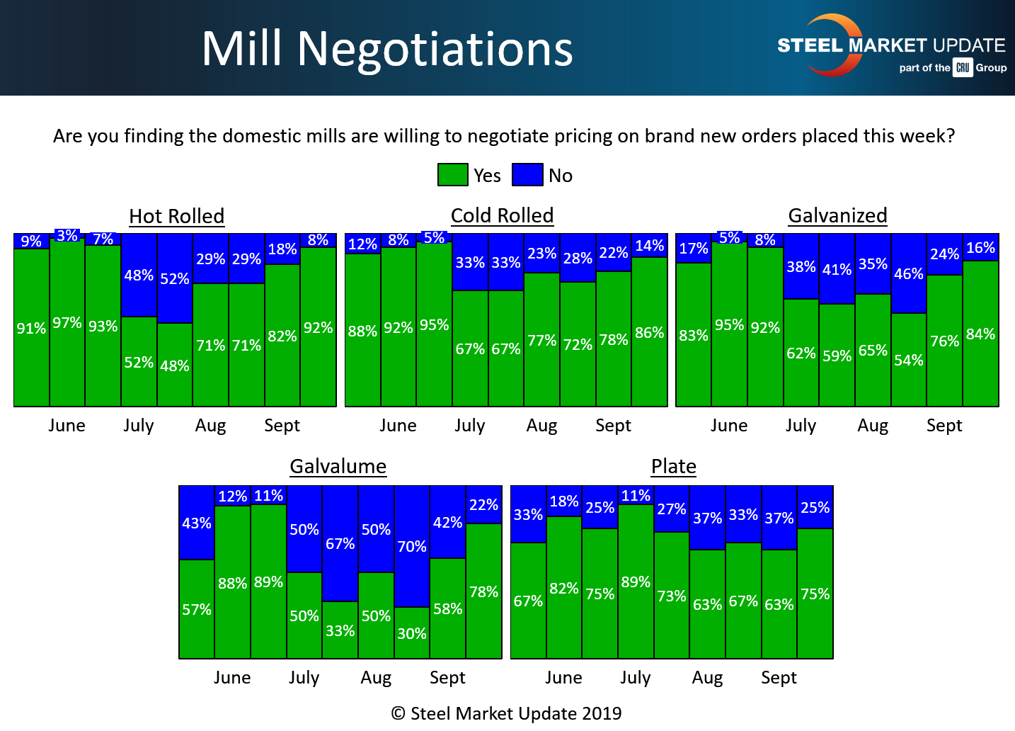 In the cold rolled segment, 86 percent said the mills were negotiating, up from 72 percent in mid-August, while just 14 percent said the mills are still standing firm.