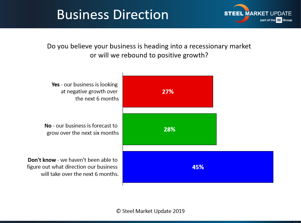 Opinions are sharply divided over whether steel is heading into a recessionary market. Roughly one-quarter of respondents said yes, their business will experience negative growth over the next six months. Another one-quarter said no, they forecast positive growth over the next six months. The other half admitted they honestly have not been able to figure out what direction the market will take through the fourth quarter and into next year.