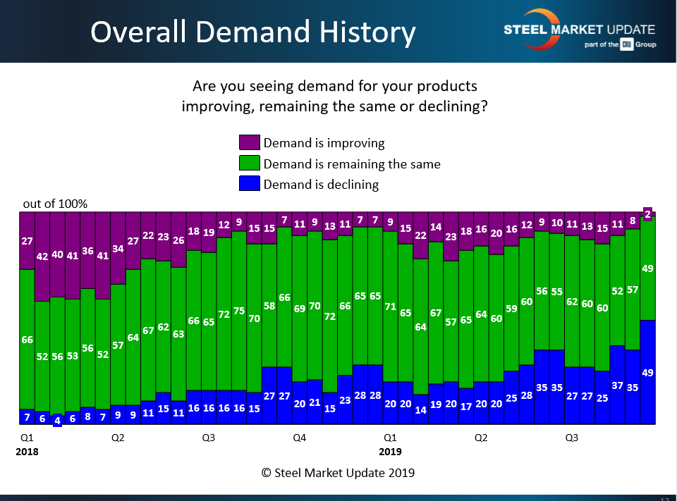 Nearly half of steel buyers responding to SMU’s questionnaire reported declining demand for their products. The same percentage see demand remaining about the same. Only a small group (2 percent) see demand improving in the current market climate.