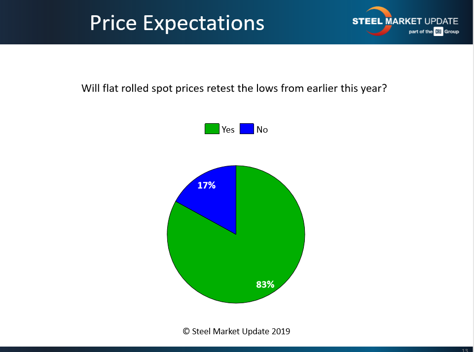 The vast majority of the respondents to SMU’s latest canvass believe flat rolled prices could hit a new low for 2019 in the fourth quarter. More than 80 percent feel flat rolled spot prices could test the market lows from earlier this year.