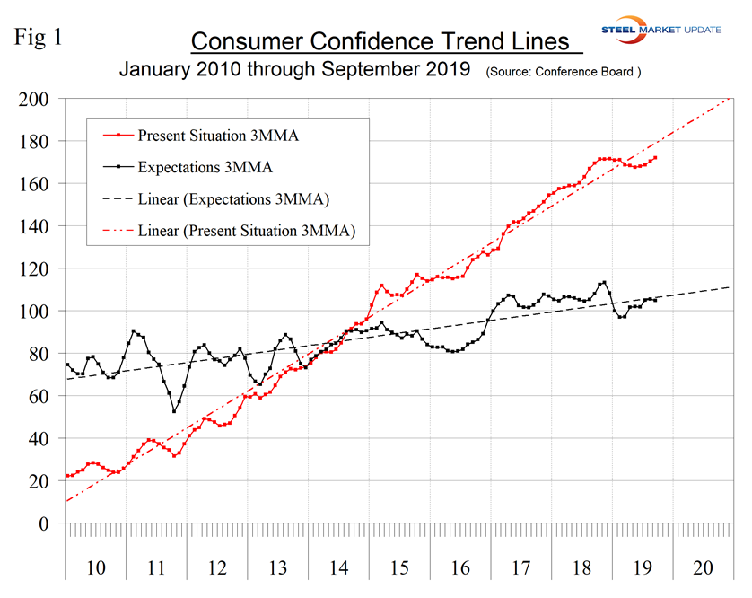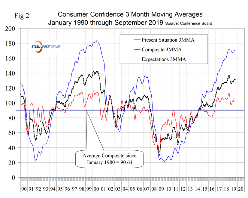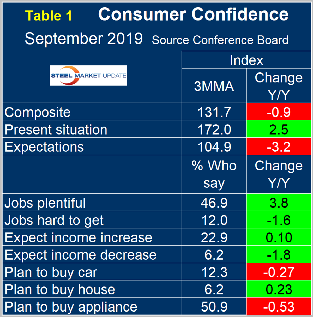 SMU Comment: The Conference Board Consumer Confidence Index is a volatile measure and must be reviewed as a three-month moving average to obtain a realistic view of trends. Based on Table 1, the September results seem to suggest a real deterioration even on a 3MMA basis. Steel demand is dependent on the growth of GDP, which in turn is strongly influenced by consumer confidence, disposable income and a willingness to spend, therefore this is a report we need to keep an eye on.