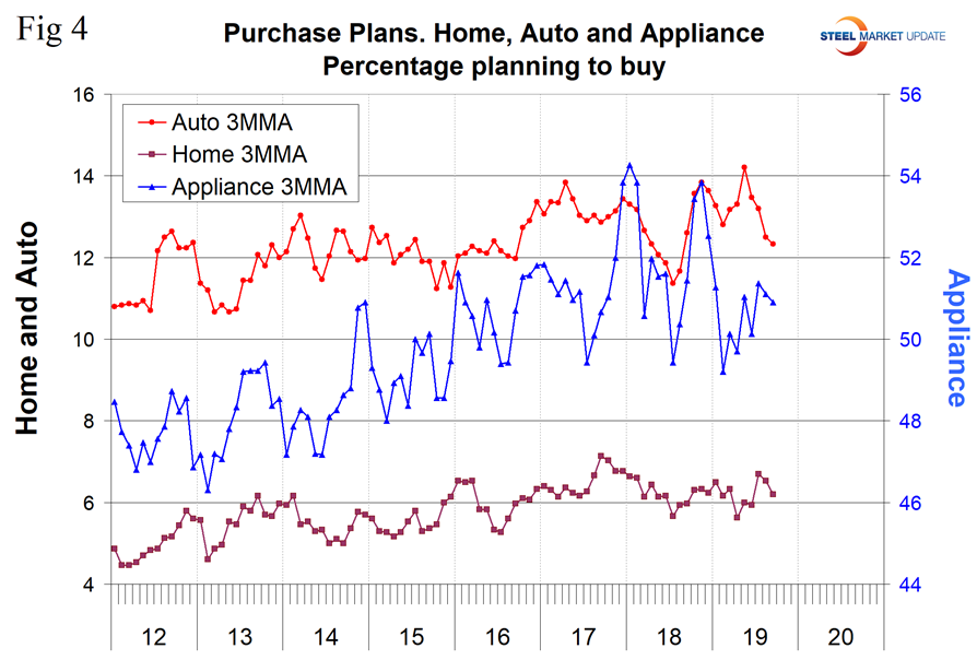 Consumer spending measures in September indicated that year-over-year plans to buy a car declined to the lowest level since August last year. Plans to buy an appliance have been improving erratically for seven months and plans to buy a house have not made progress in almost two years(Figure 4).