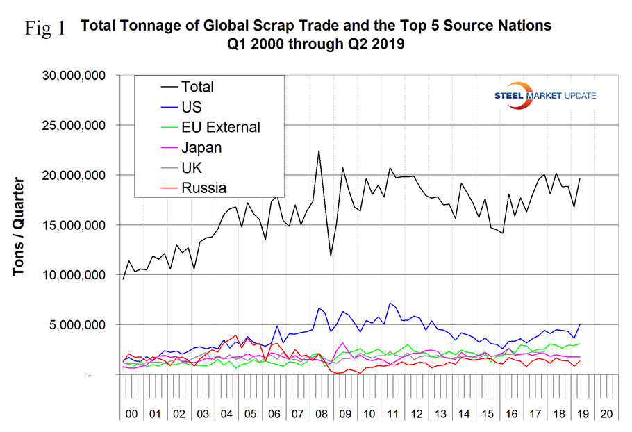 The global market share of U.S. scrap exports continues to increase, according to this quarterly analysis of data from the Iron and Steel Statistics Bureau (ISSB) in the UK. We believe that to improve our understanding of the gyrations of the domestic scrap market, we should be aware of where the U.S. stands as a global player. Some nations are slow to report, which results in our analysis being a quarter in arrears, but we believe it gives a valuable perspective of global trends and is the foundation of where we are today. All tonnages in this report are metric.