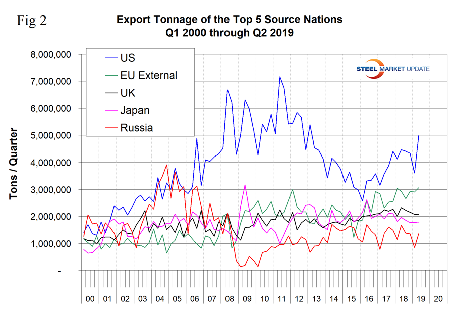 In this analysis of global scrap trade, we have excluded movements within the EU from the global total. Figures 1 and 2 show the total tonnage of global trade since Q1 2000 and the volume of the top five suppliers. These five are the U.S., the EU, the UK, Japan and Russia and since 2002 they have accounted for over two-thirds of the total. Figure 2 is the same as Figure 1 with the total removed. Total global trade in ferrous scrap has been increasing erratically since Q1 2016, and the U.S. export tonnage has increased disproportionally in the same time frame.