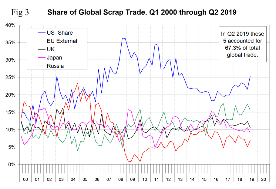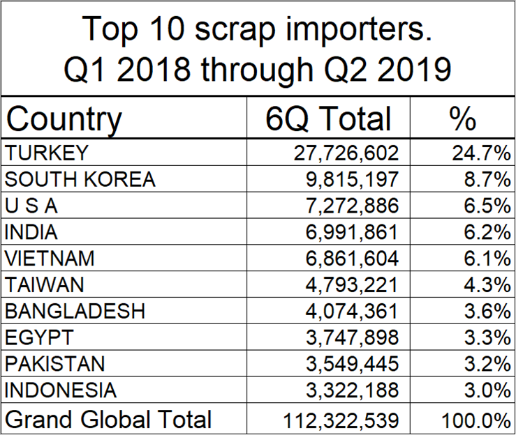 Figure 6 shows the tonnage received by the four major importing nations (excluding the U.S.). Turkey is by far the largest global scrap buyer, but imports into Turkey declined acutely in 2018 before recovering partially in the first half of 2019. The growth of Vietnam is clearly shown since Q4 2006 to the point that in Q2 2019, Vietnam accounted for 6.5 percent of total global scrap trade.