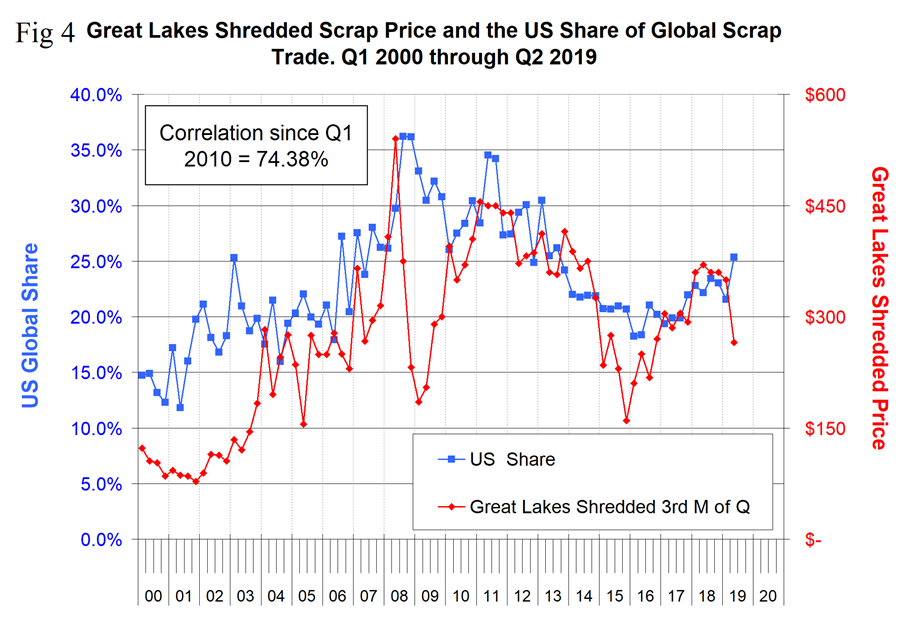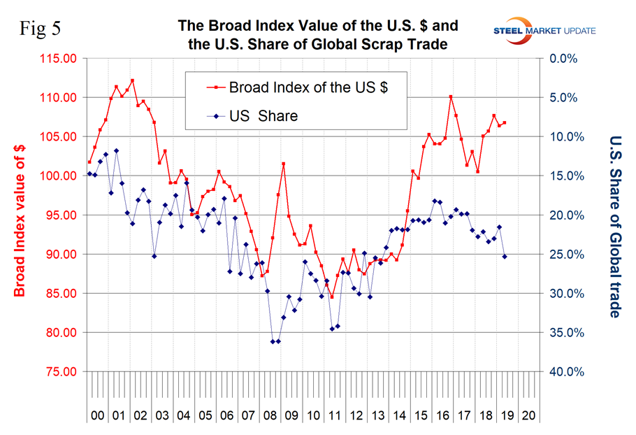 Figure 4 shows the correlation of 74.4 percent since 2010 between the U.S. share of global scrap trade and the domestic scrap price. This makes sense and tells us that export demand is a driver of the domestic scrap price. Figure 5 shows a negative correlation between the Broad Index value of the U.S. dollar and the U.S. share of global trade. This is a causal relationship—when the dollar strengthens, U.S. scrap on the global market becomes more expensive and the U.S. share should decline. Prior to Q4 2014 there was a negative 71 percent correlation between the U.S. dollar and U.S global share. Since then the two have decoupled, which we believe is due to a stronger U.S. economy that has boosted mill output and by extension domestic scrap demand and the distortive effects of Section 232 tariffs.
