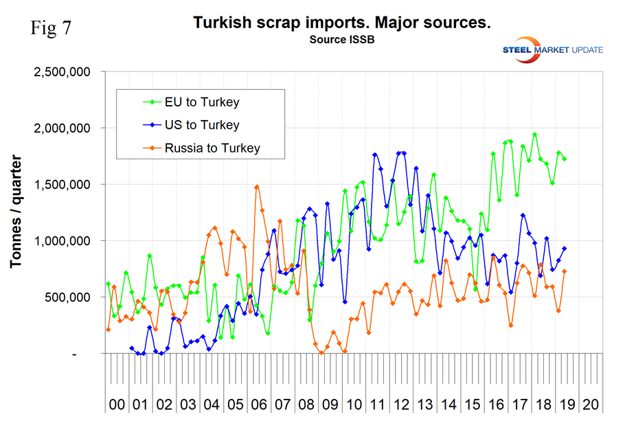 Figure 7 quantifies the volume of the three major scrap suppliers to Turkey since the year 2000. Since Q1 2016 the EU has strengthened its position as the U.S. and Russia have been erratically stable.