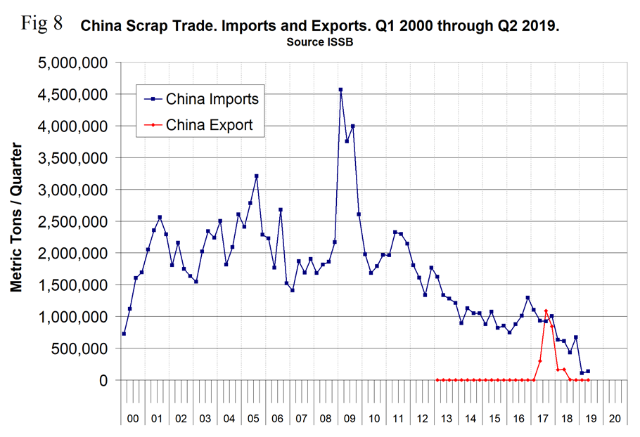 In the course of these analyses, we will keep our eye on what is going on in China. In the third quarter of 2017, China became a net scrap exporter, according to data published by their trade administration. Since then China’s exports have declined to almost zero as the government has restricted its scrap exports. In 2018 almost all scrap exporters were fined or jailed for violating the restrictions and evading taxes on the value of the material. Eventually this will change as the balance of BOF and EAF capacity in China will not be able to absorb the volume of obsolete scrap produced.