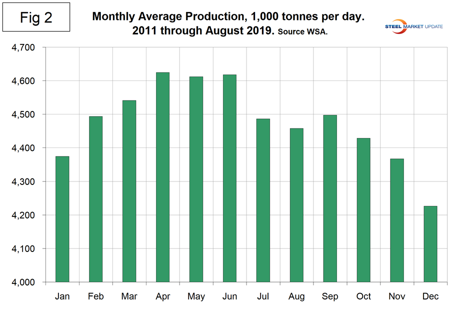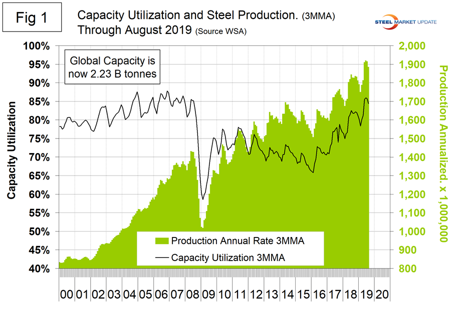 Figure 1 shows annualized monthly production on a three-month moving average (3MMA) basis and capacity utilization since January 2000. The OECD data shows that global capacity declined each year 2016 through 2018, a fact we weren’t aware of and that the WSA results did not indicate. Capacity in 2018 was 2.234 billion metric tons, down from 2.322 billion tons in 2015. Based on the OECD data, capacity utilization is higher than we have previously reported and in August on a 3MMA basis was 84.4 percent. On a tons-per-day basis, production in August was 5.033 million metric tons, down from June’s all-time high of 5.299 million metric tons.