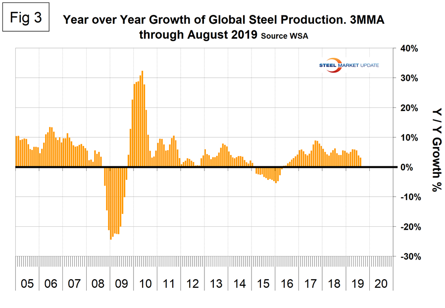Figure 3 shows the year-over-year growth rate of global production since January 2005. Growth in three months through August was 3.1 percent, down from 5.9 percent in April and May. All of this growth occurred in China. In the rest of the world, growth of steel production was negative 2.1 percent in three months through August.