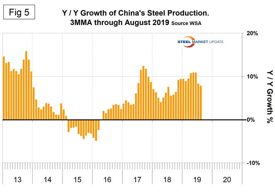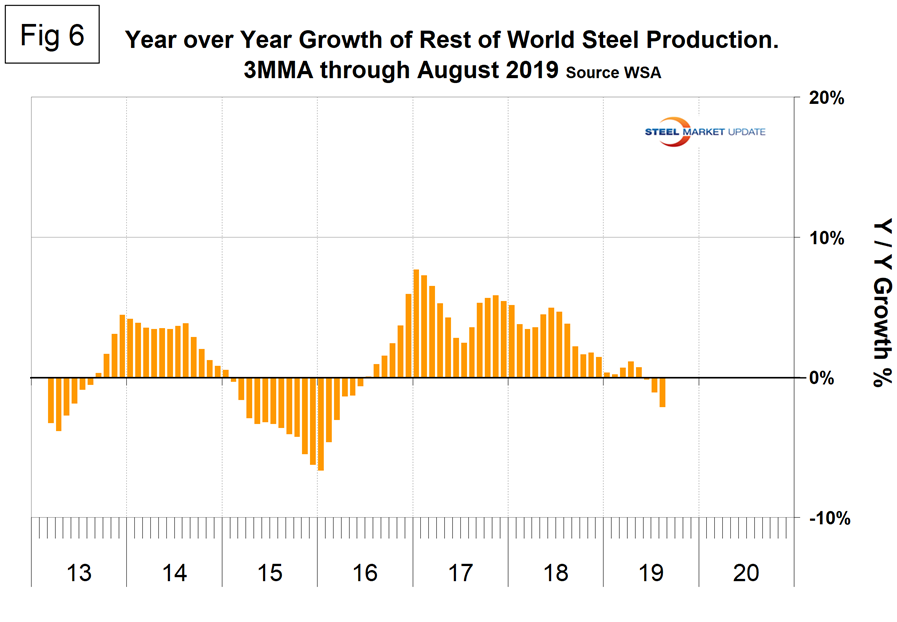 Figure 4 shows China’s production since 2005. As just stated, global steel production was up by 3.1 percent in three months through August year-over-year and China was up by 7.8 percent, both with negative momentum. The updated OECD data shows China’s capacity in 2018 to be 1,023,400,000 metric tons, and the WSA reported China’s production to be 924,752,000 metric tons, which yields a capacity utilization of 90.4 percent. This is much higher than we had previously thought. In the three months June through August, world steel production excluding China contracted by 2.1 percent.