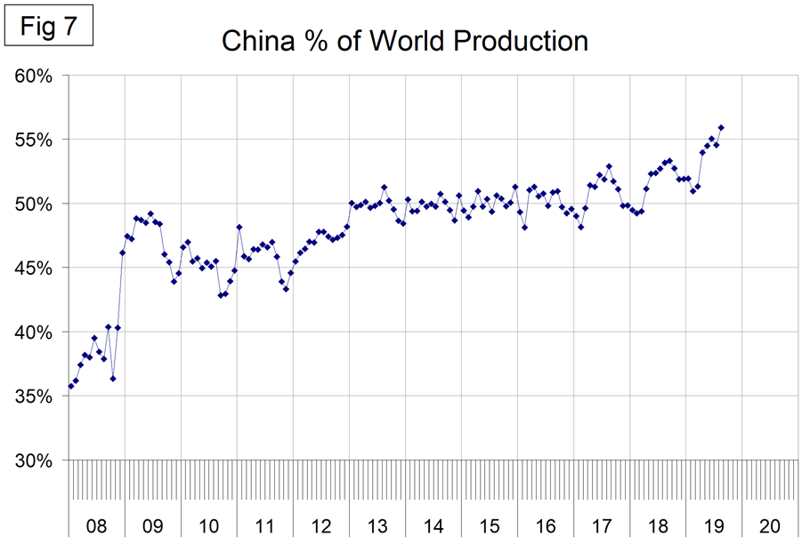 Figure 7 shows the growth of China’s share of global steel production, which in August was another all-time high of 55.9 percent.