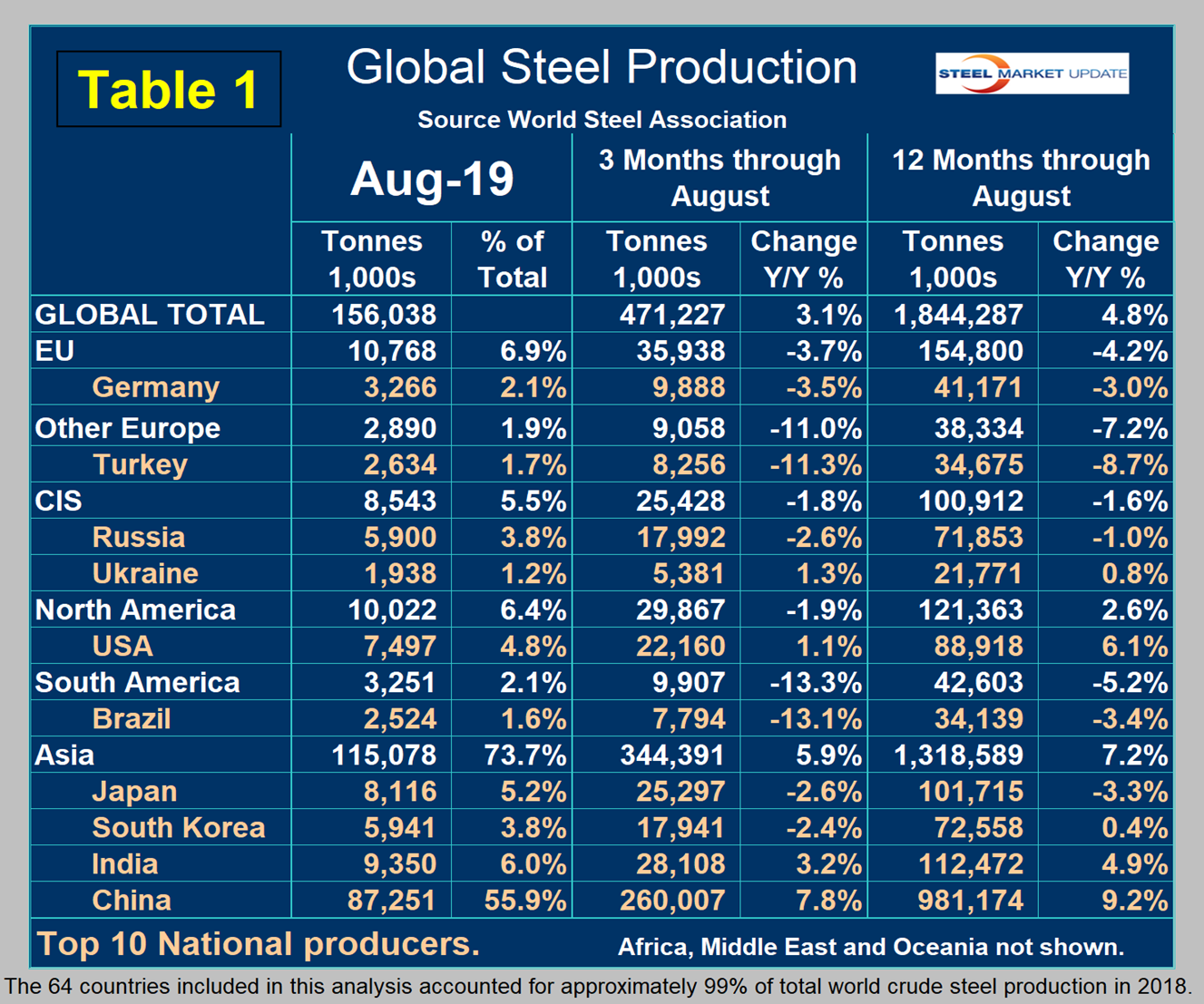 This analysis is based on data made public monthly by the World Steel Association. The WSA is one of the largest industry associations in the world. Members represent approximately 85 percent of the world’s steel production, including over 160 steel producers, national and regional steel industry associations and steel research institutes.