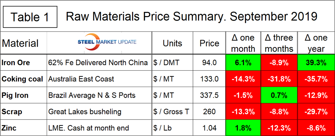 Table 1 summarizes the price changes through Sept. 25 of the five materials considered in this analysis. It reports the month / month, 3 months / 3 months and 12 months / 12 months changes on a percentage basis. Four of the five had price reversals in September as coking coal continued to decline.