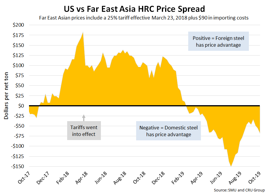 SMU includes a 25 percent import tariff effective on foreign prices after March 23, 2018. We then add $90 per ton to the foreign prices in consideration of freight costs, handling, trader margin, etc., to provide an approximate “CIF U.S. ports price” that can be compared against the SMU U.S. hot rolled price. Note that we do not include any anti-dumping (AD) or countervailing duties (CVD) in this analysis.