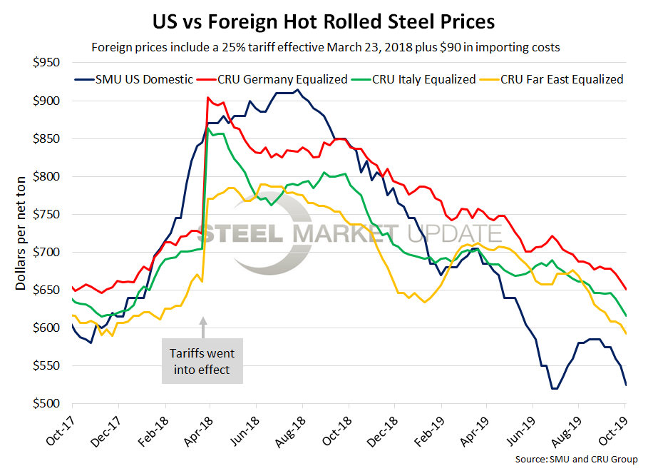 CRU published Italian HRC prices at $421 per net ton, down $10 over last week and down $18 over two weeks ago. After adding tariffs and import costs, the delivered price of Italian HRC is approximately $616 per ton. Therefore, domestic HRC is theoretically $91 per ton cheaper than imported Italian HRC; the spread was $79 the previous two weeks. U.S. prices have have now held this advantage for 26 consecutive weeks.