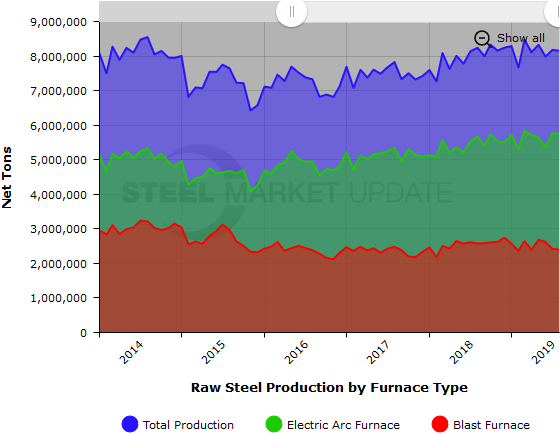 The chart below shows total monthly steel production (blue) broken down by electric arc furnace production (green) and blast furnace production (red).