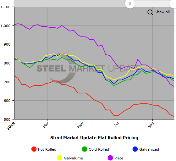 SMU Note: Below is a graphic showing our hot rolled, cold rolled, galvanized, Galvalume and plate price history. This data is available here on our website with our interactive pricing tool. Note that plate prices are not yet available on our website, but we are in the process of adding that dataset. If you need help navigating the website or need to know your login information, contact us at info@SteelMarketUpdate.com or 800-432-3475.