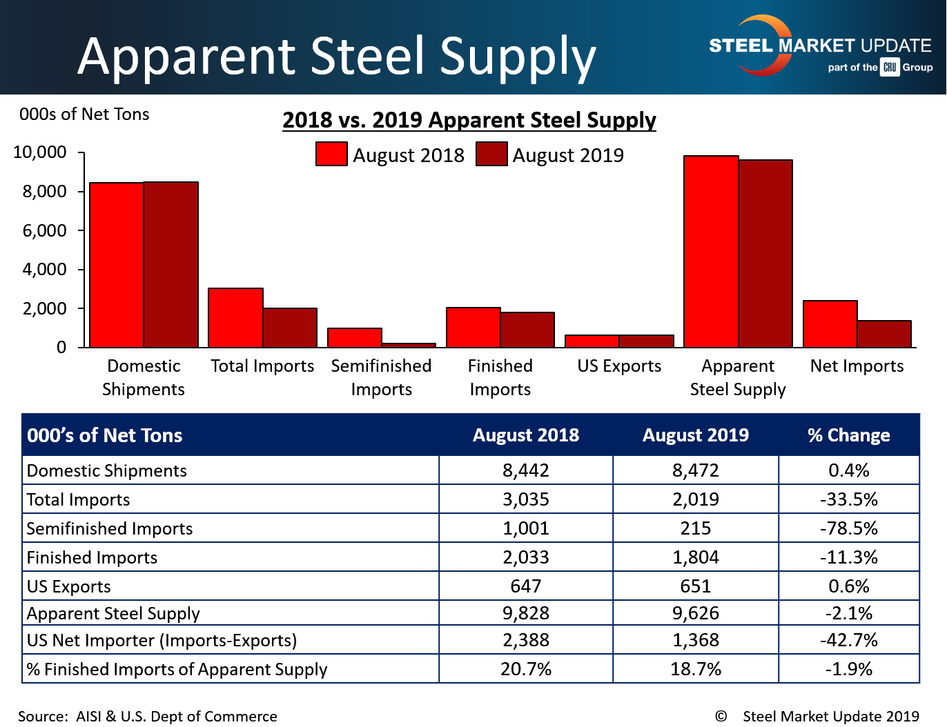 August apparent steel supply saw a 202,781 ton decrease (2.1 percent) compared to the same month one year ago. This change was primarily due to a decrease in finished imports, as domestic shipments and exports changed less than 1 percent.