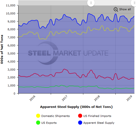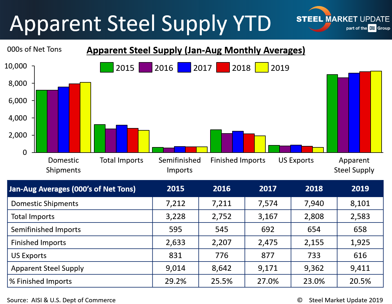 The figure below shows year-to-date totals for each statistic over the last five years. Apparent steel supply remains on the high side this year compared to previous years, as do domestic shipments and semifinished imports. Total imports remain mixed for 2019, while finished imports are marginally down and exports are down significantly.