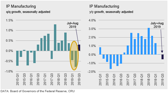 The chart to the left shows that q/q growth in manufacturing output contracted in both Q1 2019 and Q2 2019. It is encouraging that output in both July and August increased somewhat and, when averaged together, amounts to a small 0.3 percent q/q gain over the Q2 2019 level. In year-on-year terms, however, the chart to the right illustrates that the average of July and August together points to a decline in manufacturing of nearly 0.6 percent y/y. Since Q2 2018 marked a cyclical peak in the U.S. economy, we would expect H2 2019 to track below the year-ago levels.