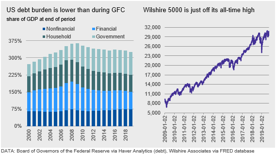 Currently there is much discussion around both the level of government debt (which has expanded due to the 2018 corporate tax cut) as well as the level of corporate debt (which expanded because of very low interest rates). In addition, the stock market has been achieving new highs, which is often a sign a correction is needed. In the two charts below, we illustrate the total debt burden of the U.S. economy as a share of GDP (left) and the value of the entire U.S. stock market as measured by the Wilshire 5000 price index (right).