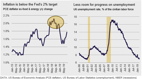 Although there are looming risks to the U.S. economic expansion, we are not ready to call for a recession just yet. Although manufacturing has been disrupted by the trade war, there are signs of potential onshoring, which should become more evident in H2 2020. Unemployment has not started to rise, and consumers are still spending. The Fed appears committed to extending the expansion by lowering interest rates and this should help consumers in terms of purchasing homes, cars and other durable goods. In addition, it keeps the cost of financing low for companies as well. Monetary policy is very limited, however, and the limits will surely be tested in 2020.