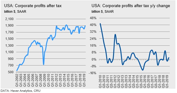 Weaker profits growth, in turn, makes it difficult for U.S. companies to spend money on capital outlays or new hiring, which is exacerbated by the lack of certainty around trade policy going forward. The chart below and to the left shows that the level of corporate profits has not expanded very much since the tax cut was implemented in 2018. The chart below and to the right shows how weak the growth in profits has been thus far in 2019.