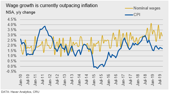The chart below shows how wage growth (gold line) has been rising since 2015, but it was largely in line with gains in inflation as measured by the consumer price index (CPI). However, since July 2018, wage gains have been far outpacing the rise in consumer price levels, indicating just how difficult it has been to find workers.
