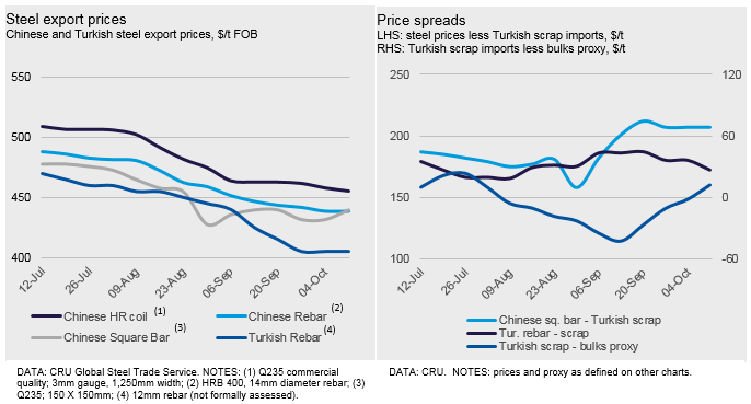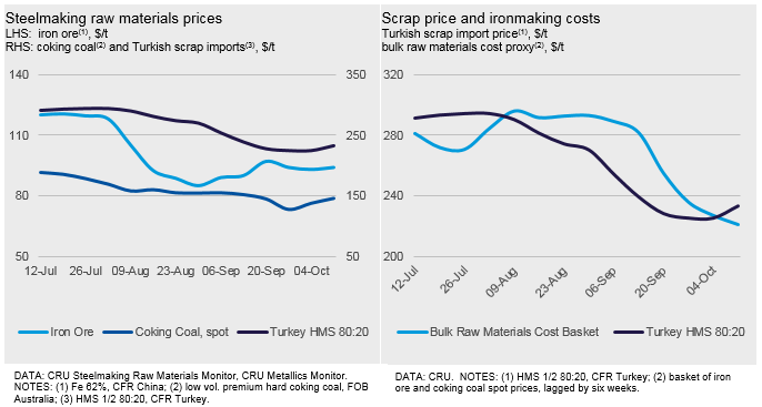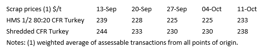 Last week, Turkish scrap import prices increased by $8 /t to $233 /t CFR for HMS 80:20, based on one 40 kt deal from the U.S. Following a number of weeks of sizable deal volumes, the market quietened. This increase comes despite sharp falls in the U.S. domestic market again for October buys.
