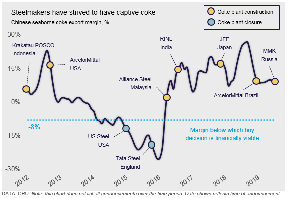 By building a coke plant, steelmakers are taking the strategic decision to make their own coke rather than buy it. Our research shows many examples of steelmakers deciding to build their own coke plants when seaborne coke margins have been positive and closing plants without building a replacement when margins have been negative. Despite this trend, our analysis into monthly movements in seaborne coke margins suggests that margins have not been consistently low enough to justify favoring the “buy” decision from a purely financial perspective.