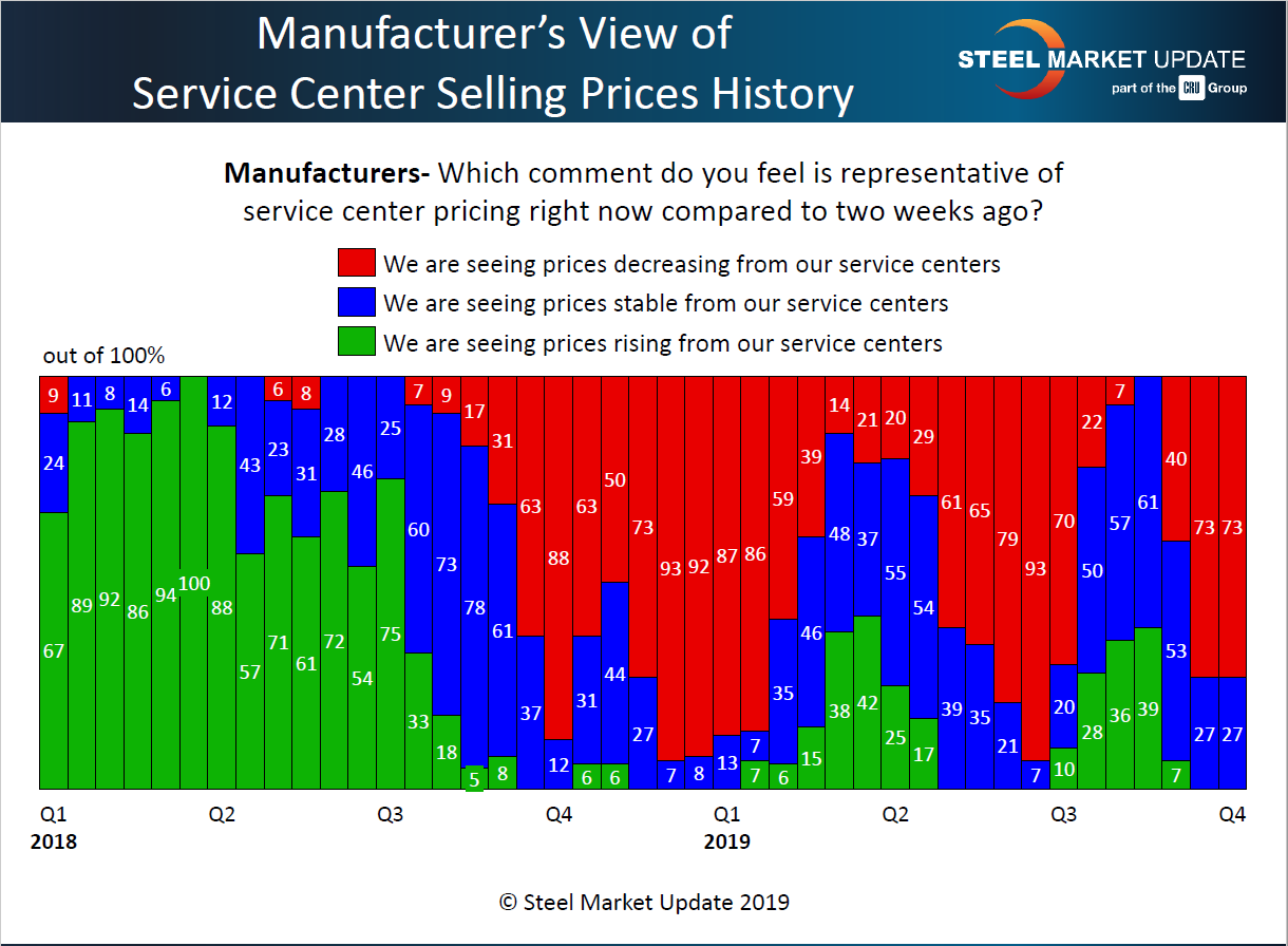 Seventy-three percent of the manufacturing companies responding to SMU’s questionnaire in early October reported their service center suppliers were lowering spot prices below levels seen just a couple weeks before.