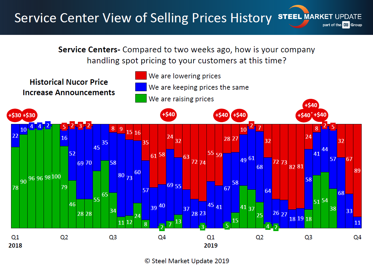 Likewise, service centers reported deepening price cuts as 89 percent said their company was lowering spot prices. Thus, the steel distributors have moved beyond the SMU “capitulation” level, which historically has been 75 percent. That’s the level at which spot selling prices begin to create issues with inventory and profitability and service centers begin to consider higher prices rather than discounting to win orders. Service centers hit the 75 percent mark twice before in 2019. In both instances the mills announced price increases and achieved modest price recovery before prices began to slide once again. Much will depend on the timing of the next mill price increase and whether the service centers have suffered enough to support it.
