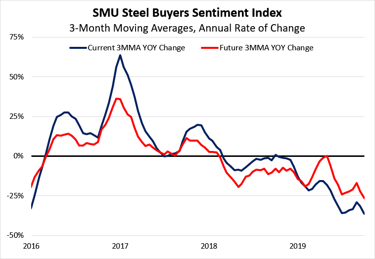 Steel Market Update’s Steel Buyers Sentiment Index has been trending downward since April and declined by 26 percentage points to a reading of +26 last month, reaching its lowest level since 2013. (Based on the annual rate of change in the three-month moving averages, both current and future sentiment have been trending downward since 2017, as shown in the chart below.) To put the latest figures in perspective, over the dozen years SMU has been tracking industry sentiment, readings have ranged from highs of +78 to lows of -85 during the Great Recession. Not counting the years prior to 2011 that were impacted by the historic recession and thus were highly anomalous, sentiment has generally moved within a 60-point range, from roughly +14 to +74. Therefore, the recent 26-point drop is significant and shows a troubling level of pessimism in the business community.
