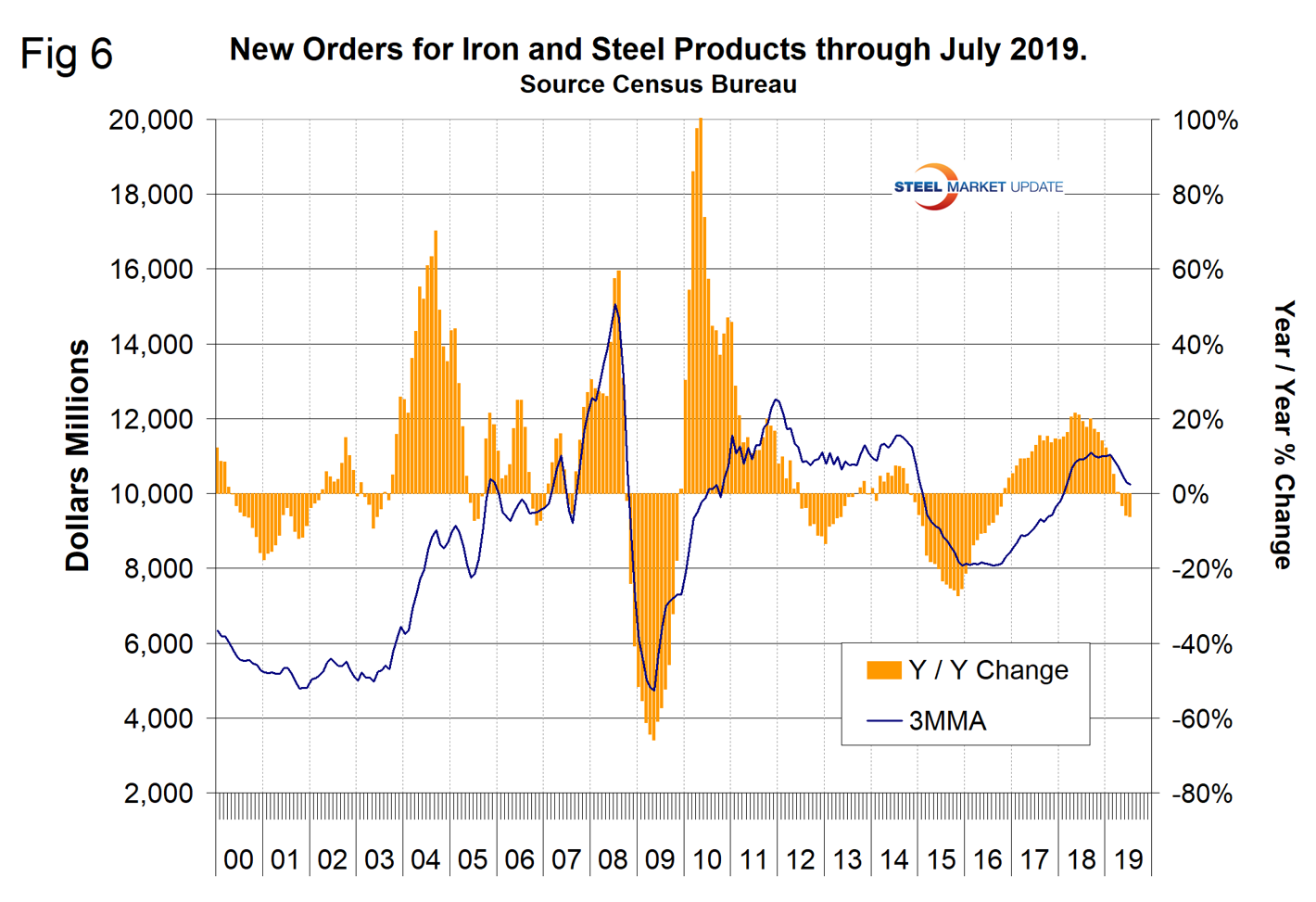 Within the Census Bureau M3 manufacturing survey is a subsection for new orders for iron and steel products. Figure 6 shows the history since January 2000. The year-over-year growth rate has declined every month from 21.6 percent in March last year to negative 6.1 percent in July 2019.