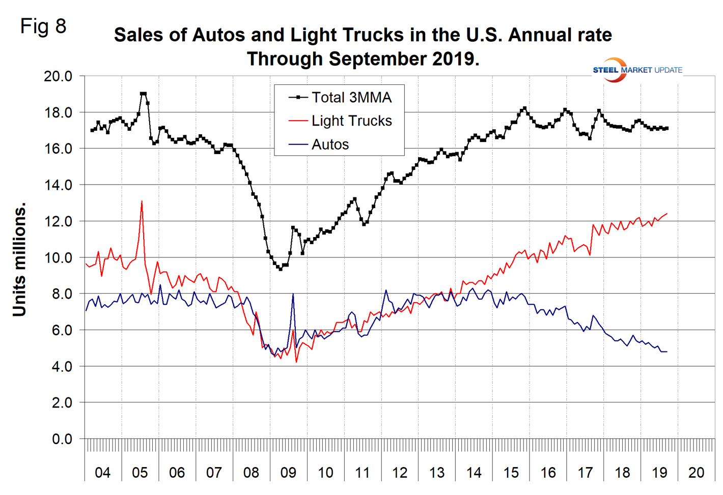 Year over year on a 3MMA basis, light vehicle sales were up by 0.8 percent in September when sales totaled 17.2 million units annualized and were comprised of 72.1 percent light trucks and 27.9 percent autos. However, light vehicle sales have trended down slightly in the last three years as measured by the cyclical peaks. Declining sales in the auto component in the last three years have resulted in GM closing several small car plants. The light truck category includes SUVs and crossovers. Overall, sales are still higher than the pre-recession level (Figure 8). Import market share in September was 22.1 percent, which was the lowest monthly result since March last year.