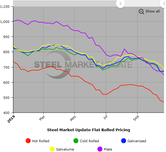 SMU Note: Below is a graphic showing our hot rolled, cold rolled, galvanized, Galvalume and plate price history. This data is available here on our website with our interactive pricing tool. Note that plate prices are not yet available on our website, but we are in the process of adding that dataset. If you need help navigating the website or need to know your login information, contact us at info@SteelMarketUpdate.com or 800-432-3475.