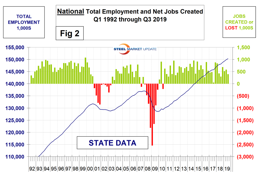 The states compile their employment numbers independently of the feds, and then both are reported by the BLS. In the almost seven years since and including Q1 2013, the feds reported total job creation of 16,658,000 and the states reported 15,974,000. Our report covers only the lower 48 states and the state numbers don’t include individuals such as the military who are employed overseas. Therefore, the federal and state totals are impressively close. Figures 1 show the history of federal data totals since 1992 and Figure 2 shows the same format for the state data.