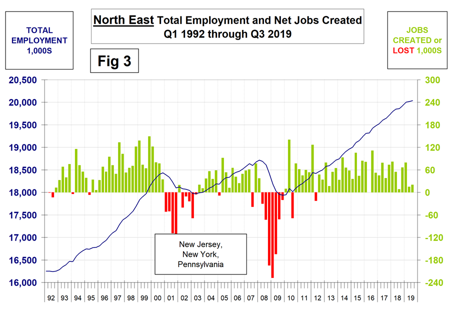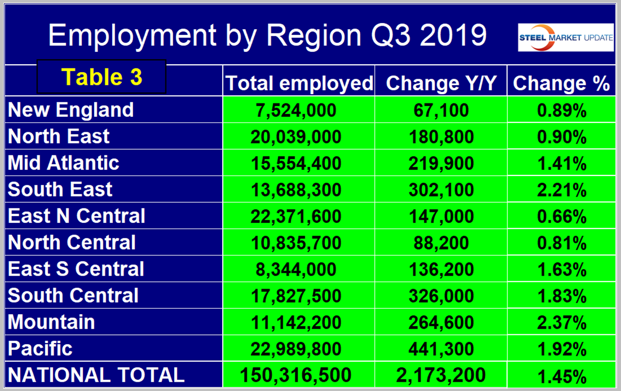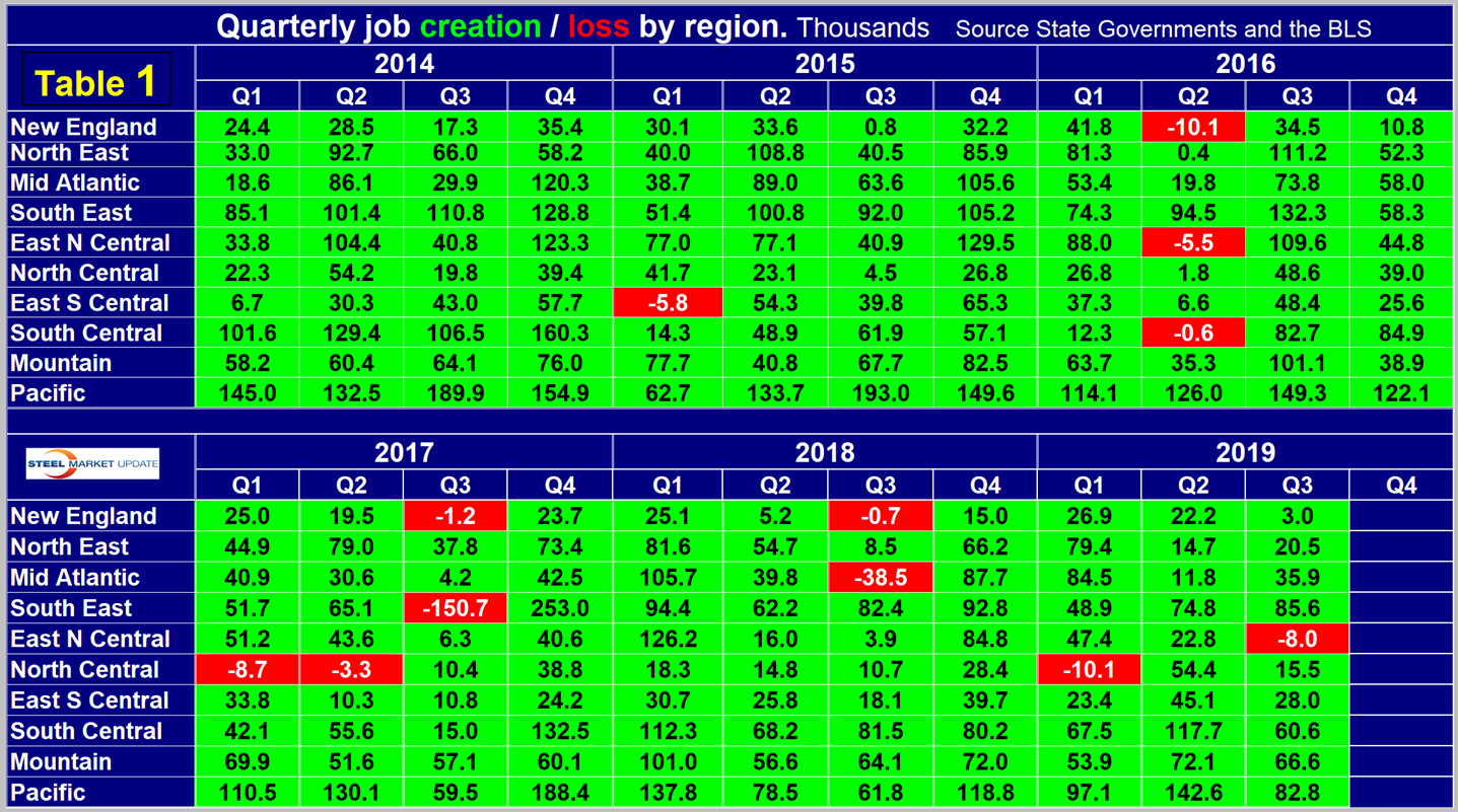 Table 1 shows the history of quarterly job creation by region since Q1 2014. In Q4 2018 and Q1 and Q2 2019, the Pacific region created the most jobs. In the latest data, the South East took over the top spot. The numbers are seasonally adjusted and all except the East North Central region had a positive net gain in the third quarter of 2019.