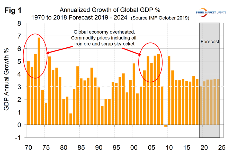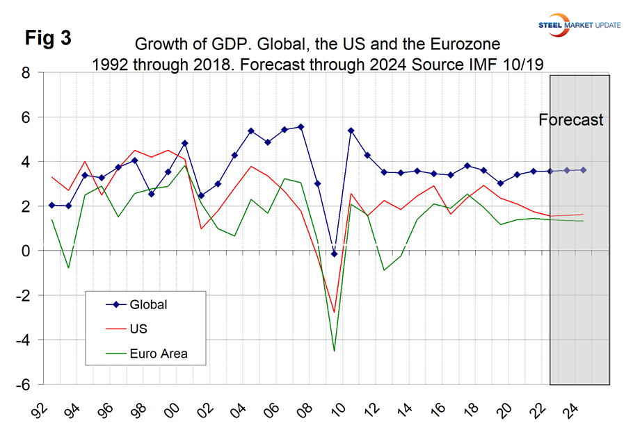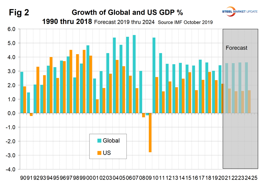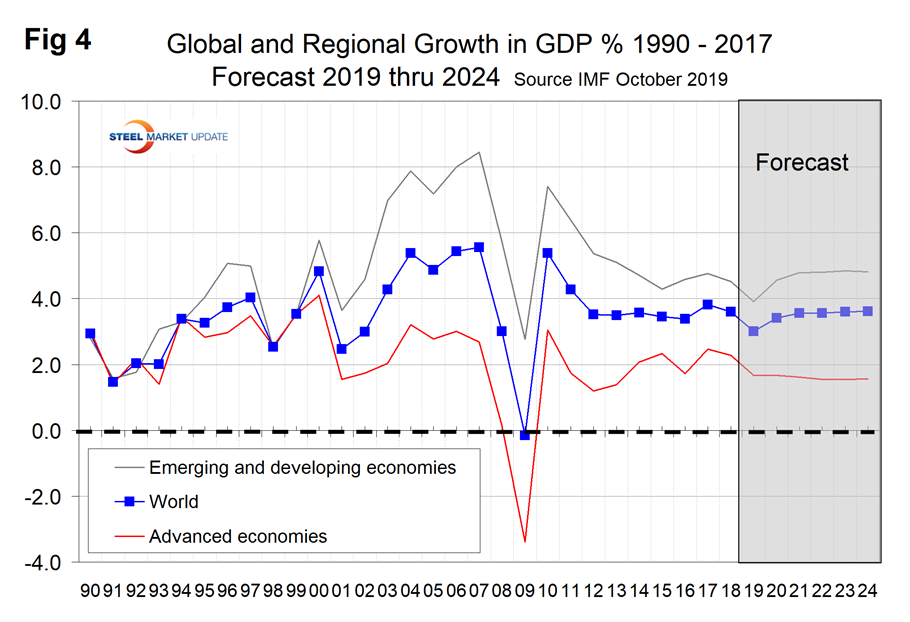 SMU Data Analysis: Figure 1 shows the growth of global GDP since 1970 with this month’s IMF forecast through 2024. We have highlighted the periods of the early 1970s and the mid-2000s when the commodity bubbles prevalent at those times were driven by unusually high and sustained global growth. The collapse of the commodity bubble in the last decade coincided with the U.S. banking and housing crisis setting up the perfect storm. After the rebound in 2010, global growth declined through 2016 and after a two-year improvement is forecast to decline again in 2019.
