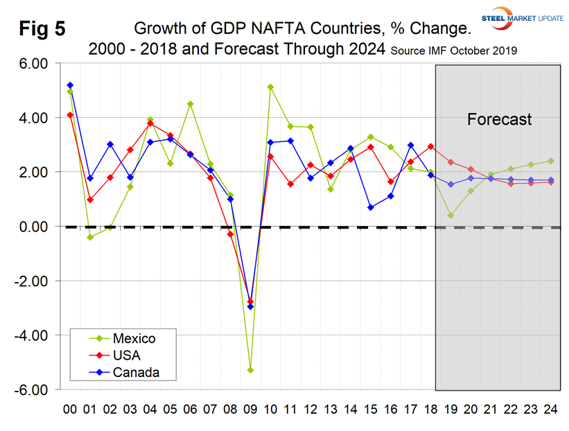 Within NAFTA, the U.S. had the highest growth rate in 2018, which is forecast to continue through 2020. In 2021 the three countries are forecast to have equal growth, then in 2022 Mexico will regain the lead and hold it through 2024 (Figure 5).