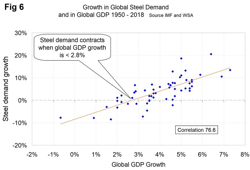 There is a relationship between the growth of GDP and steel demand at both the international and national levels, which also extends to other commodities such as cement. There are two interesting aspects to this relationship. First, the cyclical change in steel demand is vastly more volatile than the change in GDP, which we attribute to manufacturing industries in general being more fragile than service industries and the inventory response throughout the steel supply chain causes a snowball effect. Second, as discovered by our friends at “Steel Guru,” 1 percent growth in GDP does not result in 1 percent growth in steel demand. At the global level it takes a 2.8 percent increase in GDP to get any increase in steel demand (Figure 6). This is a long-term average over a period of 65 years and based on the added volatility of steel can be a predictor of the immediate future. For example, after the disastrous decline in steel demand in 2009 there was no doubt that a huge cyclical rebound would occur as inventory managers throughout the world began to react to the economic recovery. If the IMF forecast proves to be correct, then the growth in global steel demand will average around 3 percent annually through 2024.