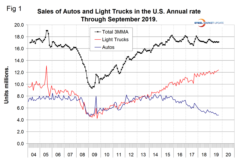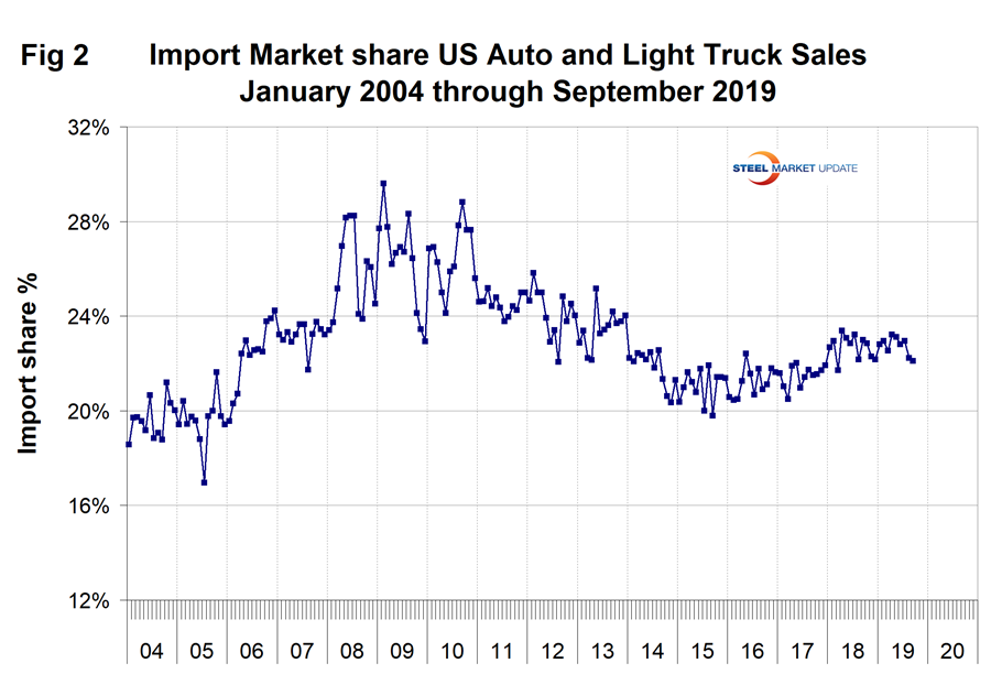 Figure 1 shows auto and light truck sales since January 2004. In September, total sales were up by 0.8 percent on a three-month moving average (3MMA) basis year over year. Light trucks that include pickups, SUVs and crossovers have been surging at the expense of cars for four years. In September, the mix was 72.1 percent light trucks and 27.9 percent autos. May was the first month ever for light trucks to exceed a 70 percent share and that share has increased every month since. In 2019, import market share had a high of 23.2 percent in April, declining to 22.1 percent in September as shown in Figure 2.