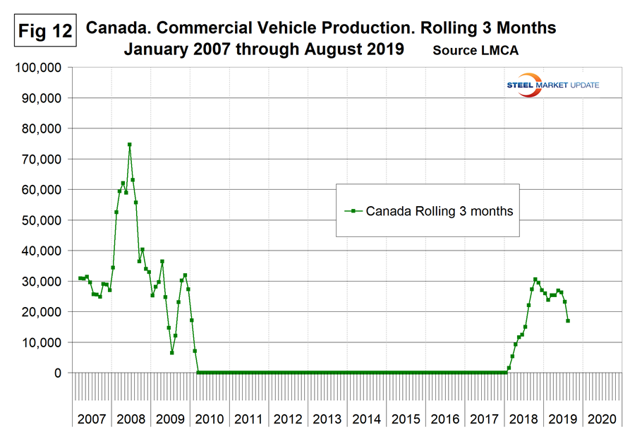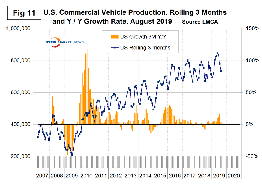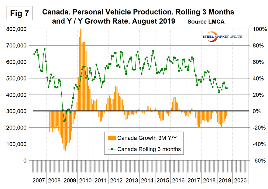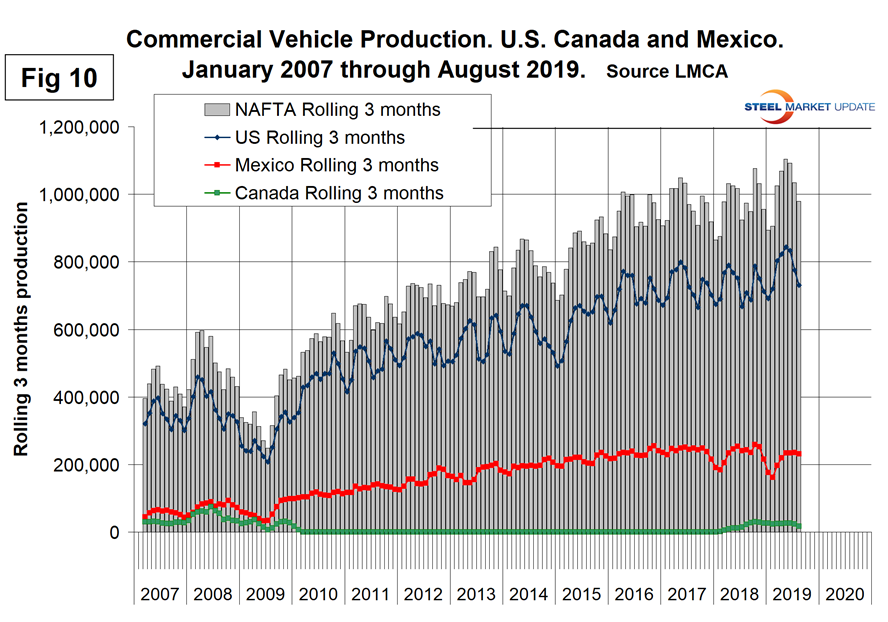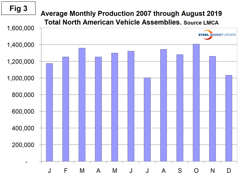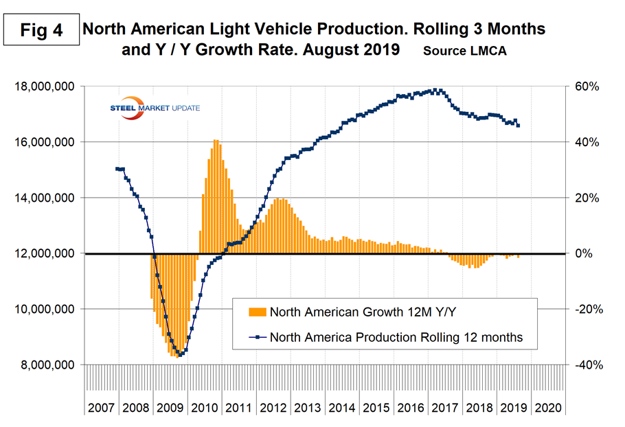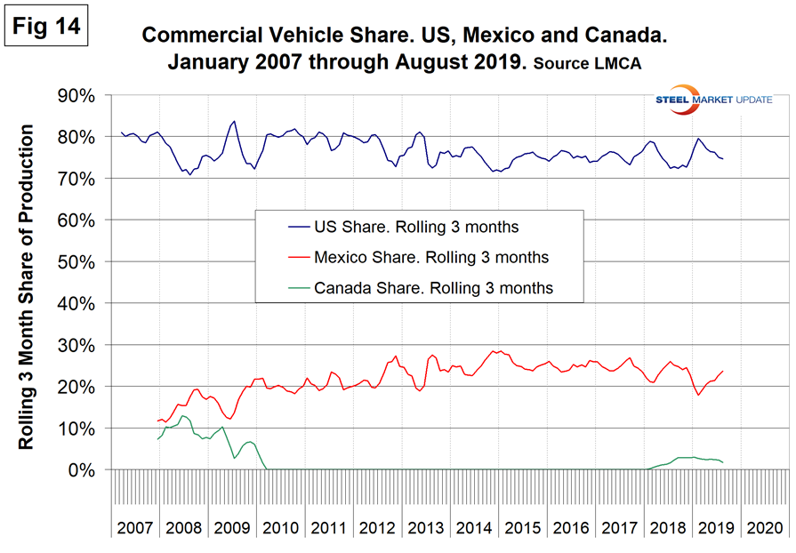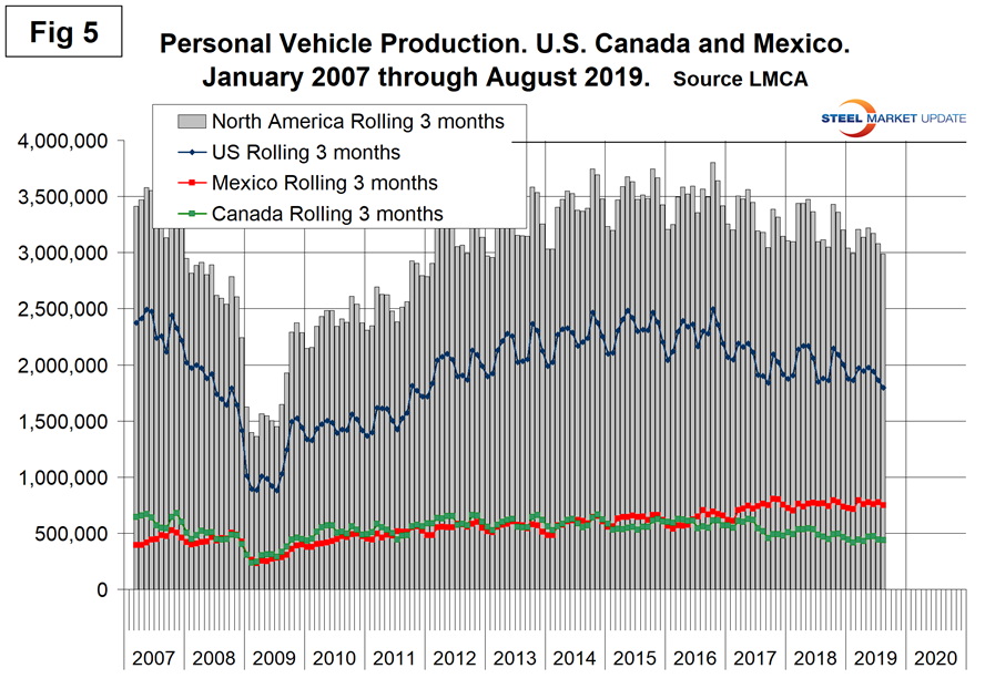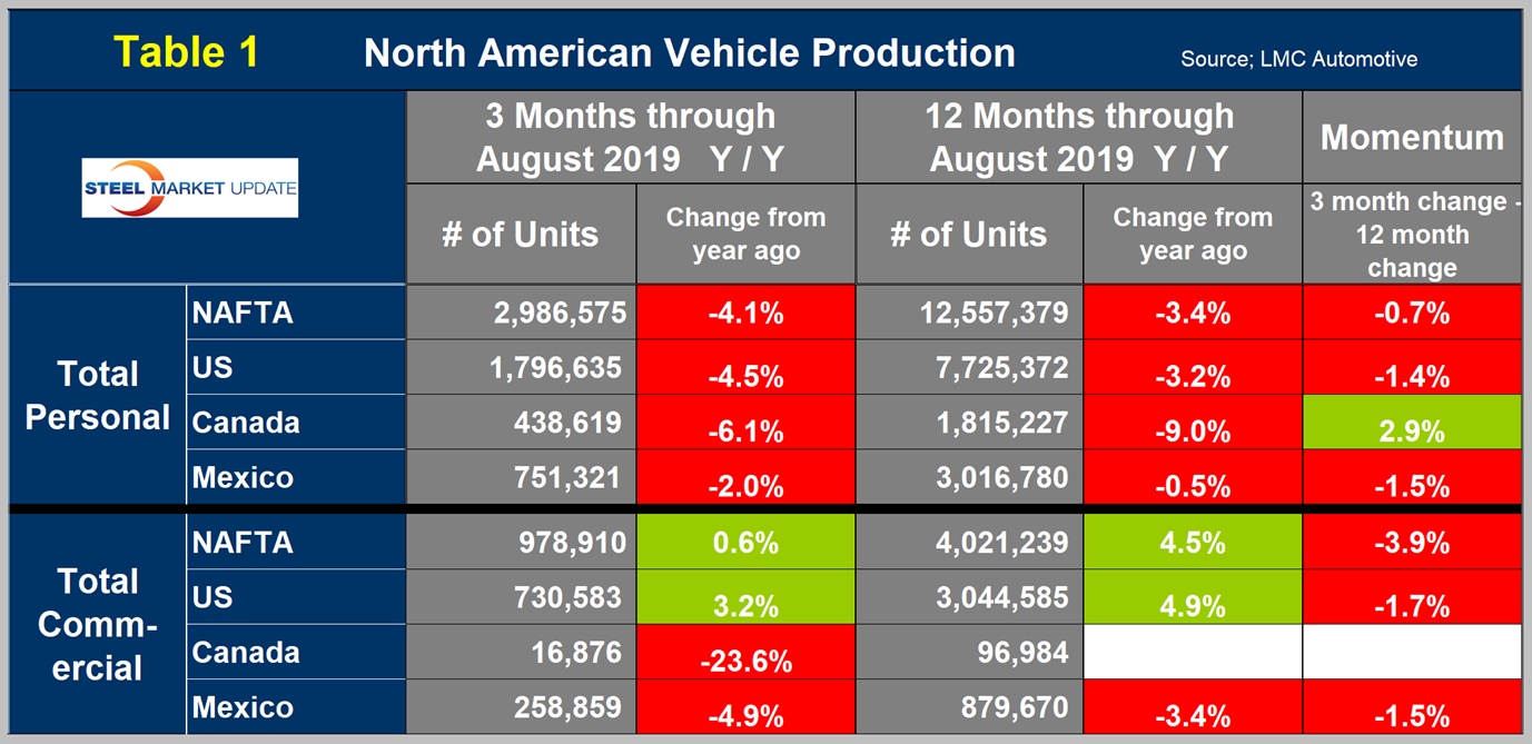 SMU Comment: North America experienced the normal July slowdown in vehicle assemblies. Mexico has been taking share of personal vehicle production but not of commercial vehicles. It remains to be seen whether the renegotiated North American trade agreement will result in a move in production share to the U.S.