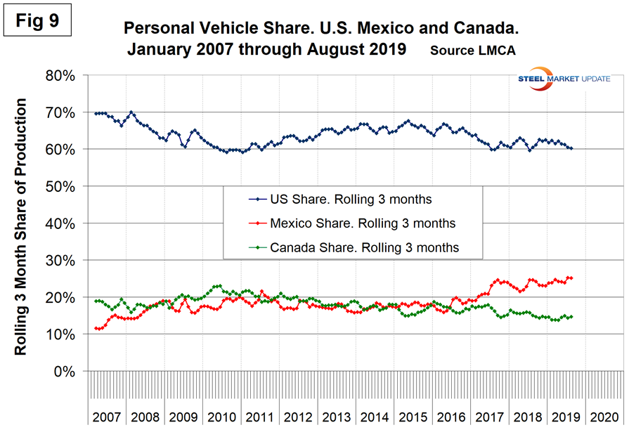 Figures 6, 7 and 8 show the production of personal vehicles by nation and the year-over-year growth rate for each. Figure 9 shows the production share for each nation. Production in the U.S. and Canada has declined since 2015 as Mexico has increased. The Mexican share rose from 17.2 percent in late 2014 to 25.2 percent in August 2019.