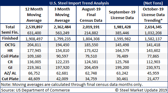 Editor’s note: The semifinished and total steel calculations in the “October License Data Trending” column in the table below have been adjusted to account for the 666,836-ton jump in semifinished import licenses from Brazil this month.