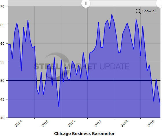 Below is a graph showing the history of the Chicago Business Barometer. You will need to view the graph on our website to use its interactive features; you can do so by clicking here. If you need assistance logging in to or navigating the website, please contact us at info@SteelMarketUpdate.com.