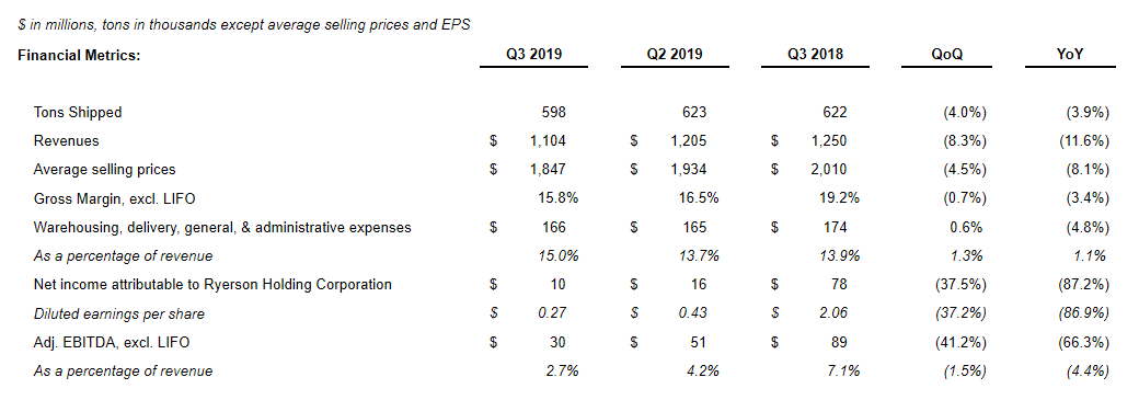 Ryerson reported third-quarter revenues of $1.10 billion, a decrease of 11.6 percent compared to $1.25 billion in third-quarter 2018, with average selling prices down 8.1 percent and with tons shipped down 3.9 percent. Net income totaled $10.1 million in the third quarter, down from $77.5 million in the prior-year period.